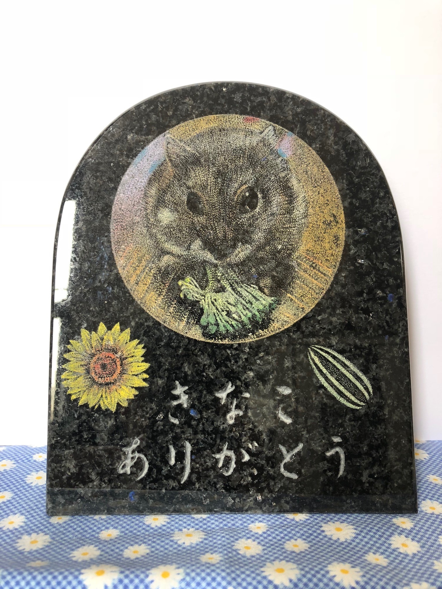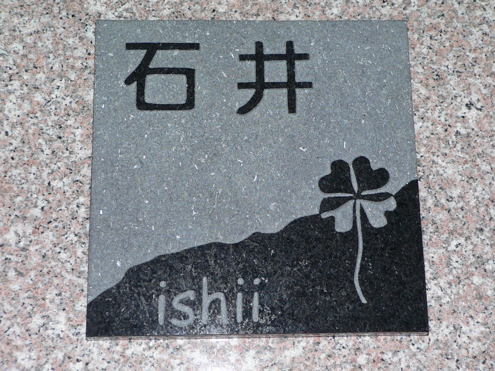 彫刻物 墓石正面の家名や家紋はエアーコンプレッサーと砂によるサンドブラストで彫刻します。墓石に砂を勢いよく吹き付けて彫刻するので浅く彫ったり深く彫ったりできるので文字の強弱がつけられます。また絵など細かい彫刻にはレーザー彫刻をします。非常に細かく彫刻できるので写真と同じように表現できます。 表札 御影石や大理石を自由な大きさに加工できます。取り付けも責任をもっておこなっています。石材店にしかできないようなデザインを考えていますのでぜひご相談ください。
